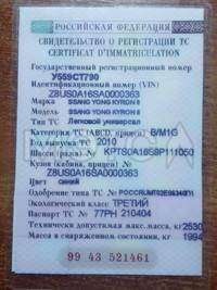 Марка и(или) модель: SSANG YONG KYRON II Год выпуска: 2010 Идентификационный номер (VIN): Z8US0A16SA0000363 Номер шасси (рамы): -- Номер кузова (кабины):-Z8US0A16SA0000363 Цвет кузова (кабины): синий Номер двигателя: - Рабочий объем (см³): 2295 Мощность (кВт/л.с.): 110/149.56 Экологический класс: ТРЕТИЙ Тип транспортного средства: Легковой универсал c 24.04.2010 по 19.02.2015: физическое лицо c 19.02.2015 по 21.09.2021: физическое лицо c 04.10.2021 по настоящее время: физическое лицо