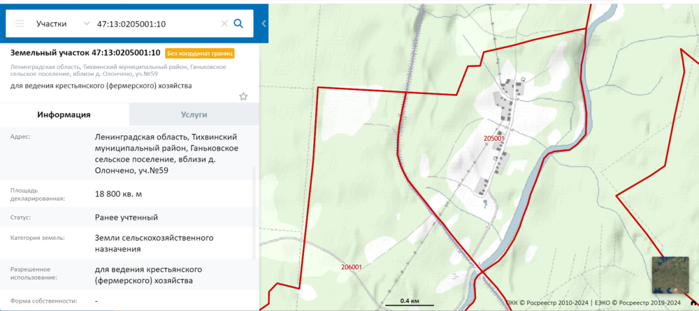 Земельный участок, площадь: 18 800м?, адрес (местонахождение): Ленинградская область, Тихвинский муниципальный район, Ганьковское сельское поселение, вблизи д. Олончено, уч.№59, категория земель: Земли сельскохозяйственного назначения, разрешенное использование: для ведения крестьянского (фермерского) хозяйства, кадастровый номер: 47:13:0205001:10