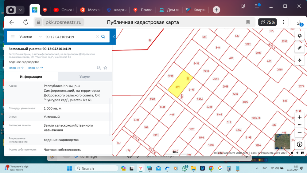 - Земельный участок с кадастровым номером: 90:12:042101:419; виды разрешенного использования объекта недвижимости: для ведение садоводства; расположенную по адресу: Республика Крым, р-н Симферопольский, на территории Добровского сельского совета, ОК "Чунгуров сад", участок № 61; площадью 1000+/-11,07 кв. м., вид права: собственность; основание государственной регистрации права: Договор купли-продажи земельного участка, № б/н, выдан 08.09.2021 г.; номер государственной регистрации: 90:12:042101:419-91/052/2021-5 от 21.09.2021 г..;