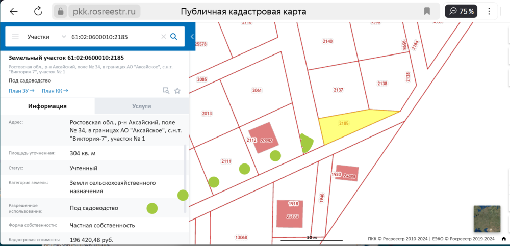 Земельный участок, площадь – 304 м2, кадастровый номер 61:02:0600010:2185, вид разрешенного использования – под садоводство, местоположение: установлено относительно ориентира, расположенного за пределами участка. Ориентир х. Большой Лог. Участок находится примерно в 1,3 км., по направлению на северо – запад от ориентира. Почтовый адрес ориентира: Ростовская область, Аксайский район, поле № 34, в границах АО «Аксайское», с.н.т. «Виктория-7», участок № 1