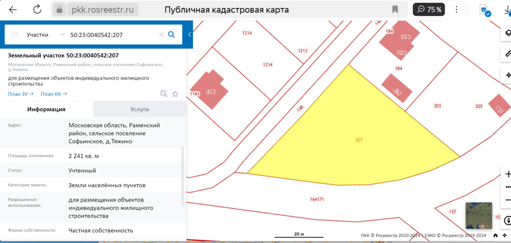 Земельный участок с кадастровым номером 50:23:0040542:207, Московская обл., р-н Раменский, с/п Софьинское, д. ТяжиноЗемельный участок с кадастровым номером 50:23:0040542:207, категория земель: земли населённых пунктов, разрешенное использование: для размещения объектов индивидуального жилищного строительства, площадь 2241 кв. м, адрес объекта: Московская область, Раменский район, сельское поселение Софьинское, д. Тяжино. Характеристики, сведения о расположении, особые отметки, ограничения / обременения см. выписки из ЕГРН в прикрепленных файлах.